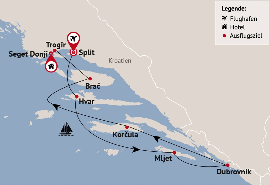 Von der UNESCO-geschützten Altstadt Trogirs aus beginnt Ihre Reise durch eine der schönsten Küstenlandschaften Europas. Nach einem kurzen Stopp in Split steuern Sie einige der bekanntesten Inseln Kroatiens an. Hvar begeistert mit seiner charmanten Altstadt und mediterranem Flair. Auf Mljet erleben Sie die unberührte Seite Dalmatiens – große Teile der Insel stehen unter Naturschutz. In Dubrovnik tauchen Sie in eine der besterhaltenen mittelalterlichen Altstädte ein, ebenfalls UNESCO-Welterbe und bekannt aus Film und Fernsehen. Die Reise führt weiter nach Korčula, der vermeintlichen Geburtsstadt Marco Polos, und zur Insel Brač, die mit dem berühmten Strand „Goldenes Horn“ beeindruckt. Freuen Sie sich auf eine Stadtführung in Trogir und einen geführten Rundgang durch Dubrovniks Altstadt.