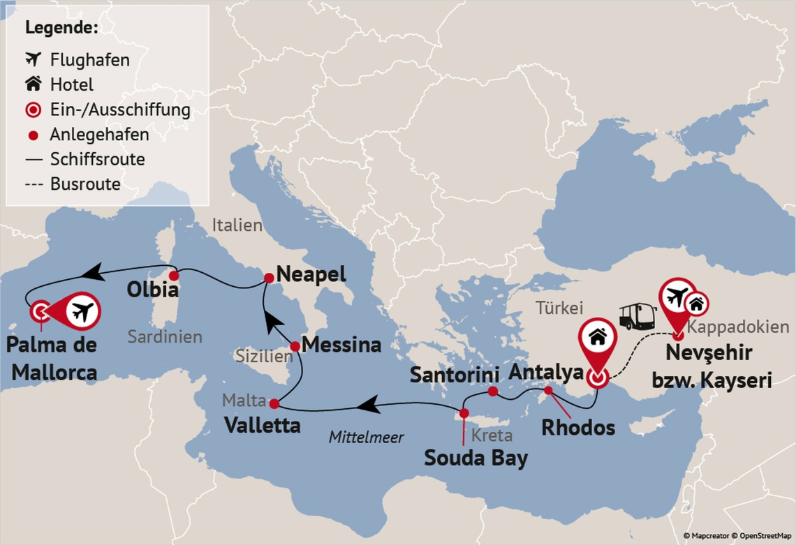 Nach den abwechslungsreichen Tagen in Kappadokien und Antalya genießen Sie nun die Annehmlichkeiten Ihres Kreuzfahrtschiffes. Freuen Sie sich auf erholsame Stunden an Deck, kulinarische Köstlichkeiten, unterhaltsame Abendprogramme und zahlreiche Möglichkeiten zur Entspannung. Ihre Route führt Sie zu einigen der schönsten Perlen des Mittelmeers mit einer einzigartigen Mischung aus mediterraner Leichtigkeit, kulturellen Schätzen und beeindruckender Natur. Erleben Sie auf Rhodos, Santorini und Kreta malerische Altstädte, geschichtsträchtige Sehenswürdigkeiten und traumhafte Küstenlandschaften. Freuen Sie sich auf die UNESCO-Welterbestadt Valletta auf Malta und auf die Highlights von Sizilien, Neapel und Sardinien in Italien. Und das beste: Ihr Schiff bringt Sie komfortabel von einem Highlight zum nächsten, während Sie an Bord stets Ihr persönliches Wohlfühlprogramm genießen.