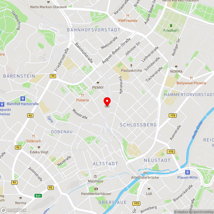 Das Hotel Alexandra befindet sich im Zentrum von Plauen, mitten in der Fußgängerzone. Den nächsten Bahnhof erreichen Sie nach ca. 750 m. Die beeindruckende Göltzschtalbrücke liegt ca. 25 km entfernt und Zwickau ca. 42 km.