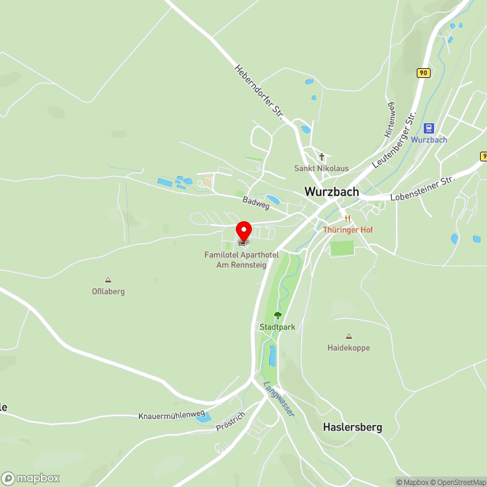 Das Aparthotel Am Rennsteig liegt in Wurzbach, etwa 500 m vom Ortszentrum entfernt. Die nächstgrößere Stadt Saalfeld erreichen Sie nach rund 36 km. Der Bahnhof sowie die Bushaltestelle befinden sich etwa 1 km entfernt.