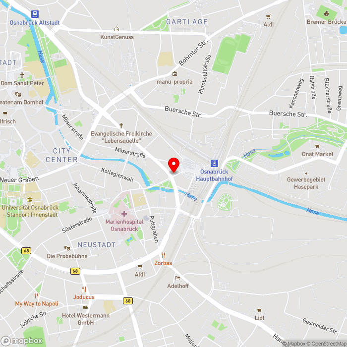 Zentral in der historischen Stadt Osnabrück befindet sich das Hotel direkt gegenüber dem Hauptbahnhof. Das Stadtzentrum mit zahlreichen Einkaufsmöglichkeiten und Restaurants erreichen Sie innerhalb ca. 800 m. Der Zoo Osnabrück ist ca. 4 km entfernt und eignet sich ideal für einen Tagesausflug.