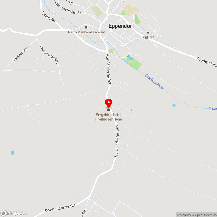 Mitten im malerischen Osterzgebirge am Ausläufer der kleinen Gemeinde Eppendorf erwartet Sie das stilvolle Erzgebirgshotel Freiberger Höhe. Das Zentrum ist ca. 1 km, der nächste Bahnhof 30 km, die nächste Bushaltestelle etwa 1 km entfernt. Wandergebiete und Fahrradwege befinden sich in unmittelbarer Umgebung. Ein Skigebiet erreichen Sie nach ungefähr 30 km.