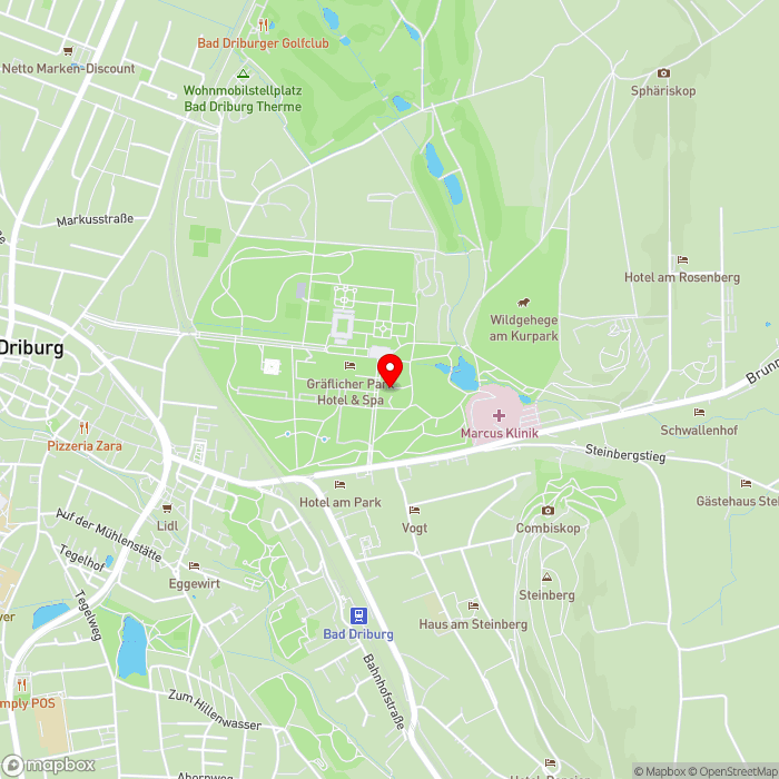 Im Gräflicher Park Health & Balance Resort genießen Sie wohltuende Ruhe inmitten einer herrlichen Parklandschaft und profitieren zugleich von einer angenehmen Nähe zu allem, was Ihnen wichtig ist. Das Ortszentrum von Bad Driburg erreichen Sie nach nur etwa 2 km. Paderborn, die nächstgrößere Stadt mit vielen kulturellen Höhepunkten, liegt rund 25 km entfernt. Der Bahnhof von Bad Driburg und die nächste Bushaltestelle liegen beide nur etwa 500 m vom Resort entfernt.