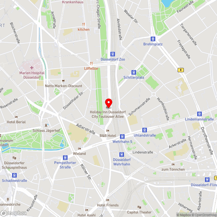 Ihr Hotel liegt zentral im modernen Stadtteil Le Quartier Central, nur etwa 5 Gehminuten vom Bahnhof „Düsseldorf Wehrhahn“ entfernt. Von dort erreichen Sie die historische Altstadt, die elegante Königsallee und die Rheinuferpromenade bequem mit der Bahn in wenigen Minuten. Das Goethe-Museum im Schloss Jägerhof ist etwa 1,2 km entfernt und in ca. 15 Minuten zu Fuß erreichbar. Die KD-Anlegestelle an der Unteren Rheinwerft, unterhalb des Burgplatzes, befindet sich ca. 2,5 km vom Hotel entfernt. Mit öffentlichen Verkehrsmitteln oder dem Taxi erreichen Sie sie in etwa 10–15 Minuten. Von hier starten traumhafte Schifffahrten auf dem Rhein – ein stimmungsvoller Höhepunkt Ihrer Reise.