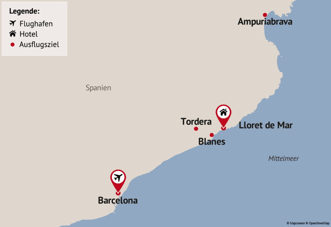 Ihr Urlaubshotel, das RRRRHotel Alegria Mariner, befindet sich in Lloret de Mar – direkt an der Küste. Die Halbpension Plus mit inkludierten Getränken sowie die zentrale Lage machen es zum idealen Standort für diese abwechslungsreiche Reise. Wer in entspannter Atmosphäre Kultur, Natur und kulinarischen Genuss miteinander verbinden möchte, findet hier das perfekte Reiseziel.