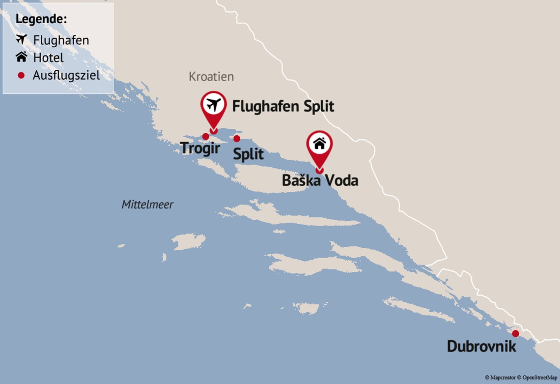 Zwischen Pinienhainen, glasklarem Meer und historischem Erbe zeigt sich die Makarska Riviera von ihrer schönsten Seite. Wer Dalmatien erleben möchte, muss nicht täglich den Koffer packen: Diese Standortrundreise kombiniert Urlaub in Baška Voda mit eindrucksvollen Ausflügen zu kulturellen Höhepunkten wie Split, Trogir und Dubrovnik – und einem geselligen Abend in den Bergen.