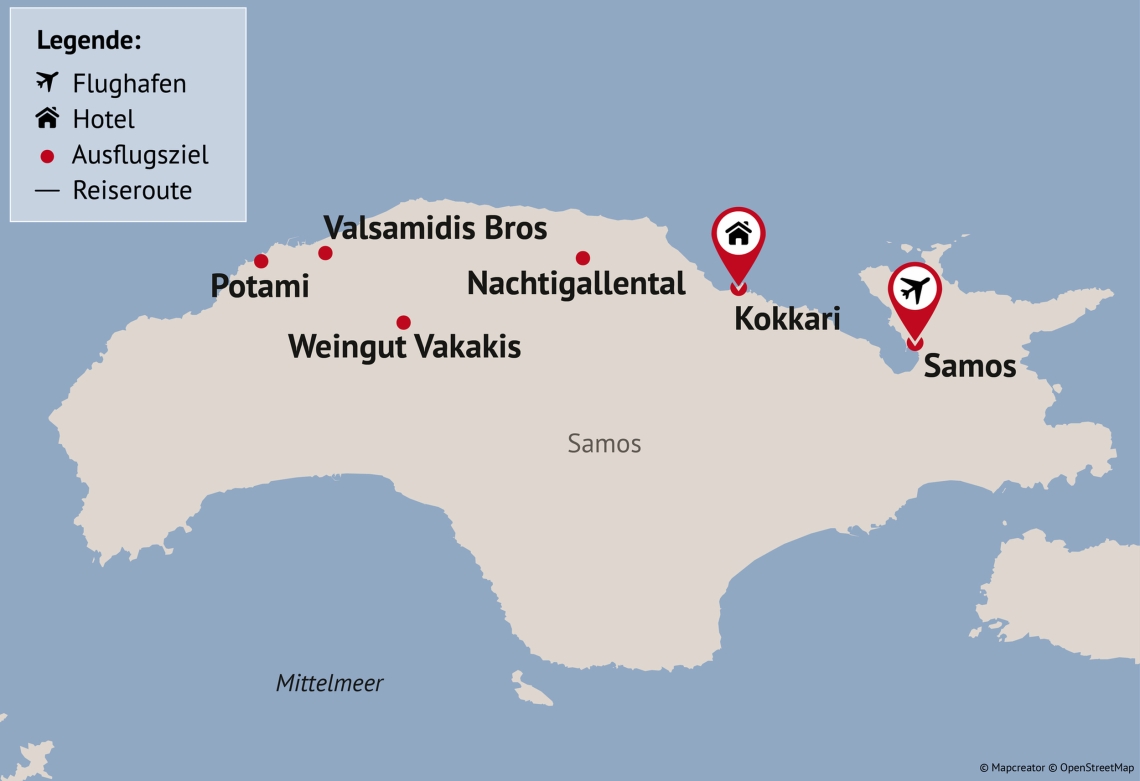 Wer möchte, erweitert seine Eindrücke bei einer Bootstour entlang der zerklüfteten Ostküste. In Posidonio schaukeln bunte Boote im Wasser, während sich Kasonisi mit türkisblauem Meer fast karibisch zeigt. Kleine Buchten wie Megali Lakka liegen eingebettet zwischen Felsen und duftender Macchia. Eine optionale Inselrundfahrt führt Sie zu kulturellen Höhepunkten: Der antike Tunnel des Eupalinos, das Kloster Megali Panagia und das Töpferdorf Koumaradei stehen exemplarisch für die Vielfalt zwischen Geschichte, Glauben und Kunsthandwerk. In Karlovasi und Kokkari zeigt sich das Inselleben mal lebendig, mal beschaulich. Überall begegnet Ihnen die unverfälschte Herzlichkeit der Menschen, die ihre Insel lieben