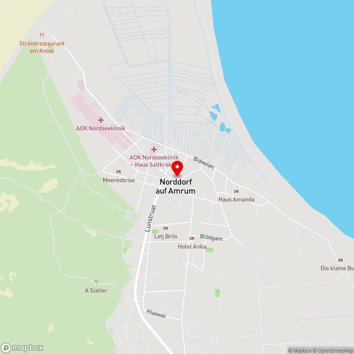 Ihr Hotel liegt etwa 250 m vom Ortszentrum Norddorf entfernt. Bis zur nächsten Bushaltestelle sind es ca. 140 m. Den nächsten Bahnhof in Niebüll errreichen Sie mit Fähre und Shuttle-Bus in ca. 2 Stunden. Ihr Hotel ist nur ca. 1 Kilometer vom Strand entfernt.