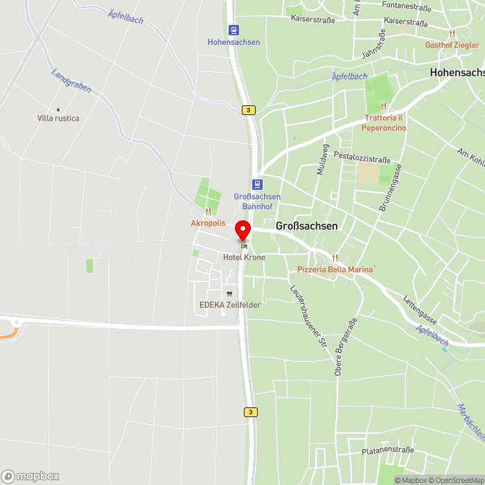 Das Hotel Krone befindet sich in Hirschberg, im Ortsteil Großsachsen. Weinheim liegt ca. 5 km entfernt, dort befinden sich auch das Strandbad Waidsee und der nächstgrößere Bahnhof. Die Straßenbahnhaltestelle "Großsachsen Süd" erreichen Sie nach etwa 5 Gehminuten. Heidelberg liegt ca. 17 km entfernt und Mannheim rund 21 km.