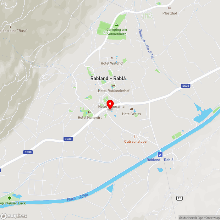 Ihr Hotel liegt eingebettet in der hügeligen Landschaft von Trentino-Südtirol im beschaulichen Rabland. Die Gemeinde liegt im malerischen Vinschgau nur wenige Kilometer von der Kulturstadt Meran entfernt. Eine Bushaltestelle befindet sich gegenüber vom Hotel und der Bahnhof Rablà ist rund 900 m entfernt.