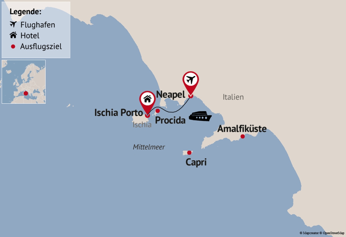 Sanfte Hügellandschaften, dichte Pinienwälder und heiße Thermalquellen bilden die Kulisse Ihrer Urlaubsreise auf die Insel Ischia. In Forio, einem charmanten Küstenort im Westen der Insel, erwartet Sie das Hotel San Giovanni Terme – Ihr komfortables Zuhause für diese vielseitige Standortrundreise. Freuen Sie sich auf ein großes Ausflugspaket, das Sie zu den schönsten Orten der Umgebung führt, darunter die Küstenstadt Neapel, die malerische Insel Procida und die weltberühmte Amalfiküste.