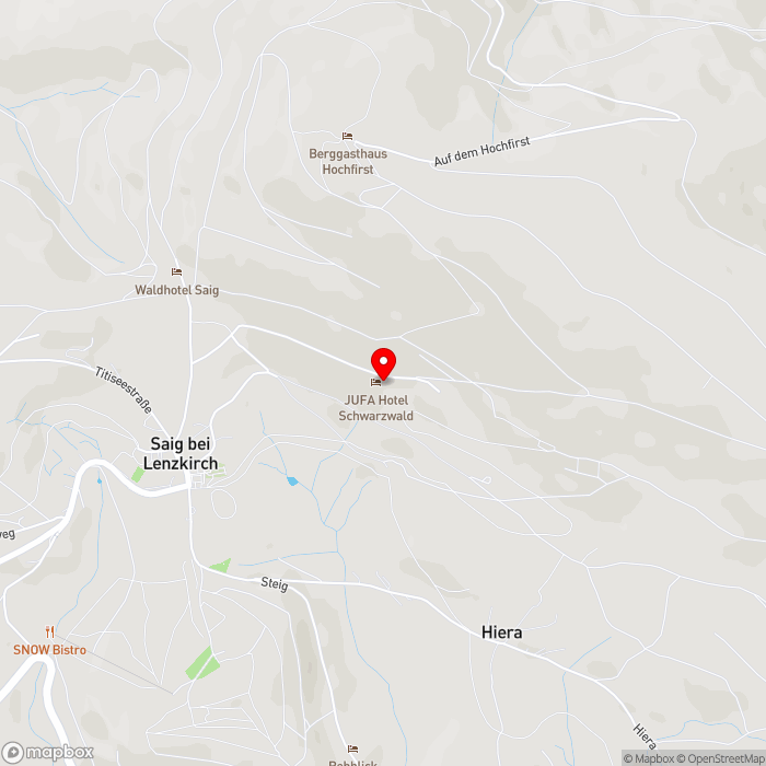 Das JUFA Hotel Schwarzwald erwartet Sie auf 1.050 Höhenmetern im idyllischen Ort Saig im wunderschönen Schwarzwald. Es ist umgeben vom Titisee, dem Schluchsee und dem Feldberg, dem höchsten Berg in Baden-Württemberg. Auch Wander- und Radwege befinden sich direkt vor der Haustür. Sie erreichen das Ortszentrum von Lenzkirch nach ca. 5 km, den nächsten Bahnhof in Titisee nach knapp 15 km und die nächste Bushaltestelle nach rund 1,5 km.