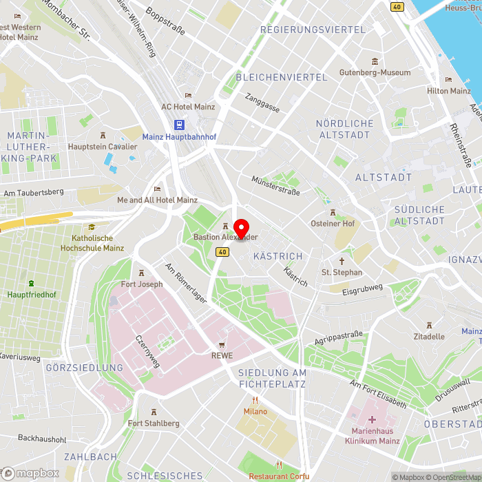 Ihr Hotel begrüßt Sie in ruhiger und dennoch zentraler Lage in Mainz und ist ein idealer Ausgangspunkt, um die charmante Stadt am Rhein zu entdecken. In der näheren Umgebung laden Spazierwege, Cafés und Restaurants zum Verweilen ein, während die Innenstadt mit ihren vielfältigen Einkaufs- und Freizeitmöglichkeiten schnell erreichbar ist (ca. 2 km).