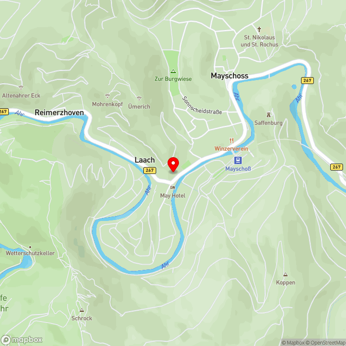 Das May Hotel Mayschoß befindet sich neben den idyllischen Weinbergen des beschaulichen Ortes Mayschoß. Den Ortskern erreichen Sie nach etwa 1 km, die nächste Bushaltestelle nach ungefähr 250 m und den Bahnhof von Remagen nach rund 25 km. Die Stadt Bonn ist ebenfalls ungefähr 25 km entfernt. Mayschoß, als Teil des Ahrtals, bietet mehrere schöne Radwege und eine Vielzahl an Wanderwegen.
