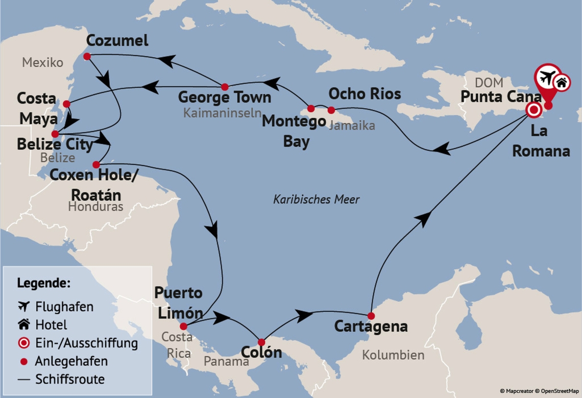 | 4 | Transfer zum Hafen von La Romana und Einschiffung | 22:00 | |