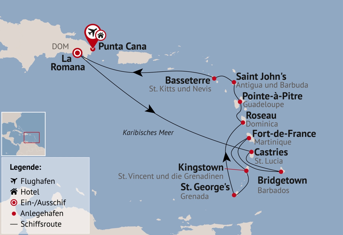 | 18 | La Romana / Dominikanische Republik, Ausschiffung, Transfer zum Flughafen und Rückflug nach Deutschland | 07:00 | |