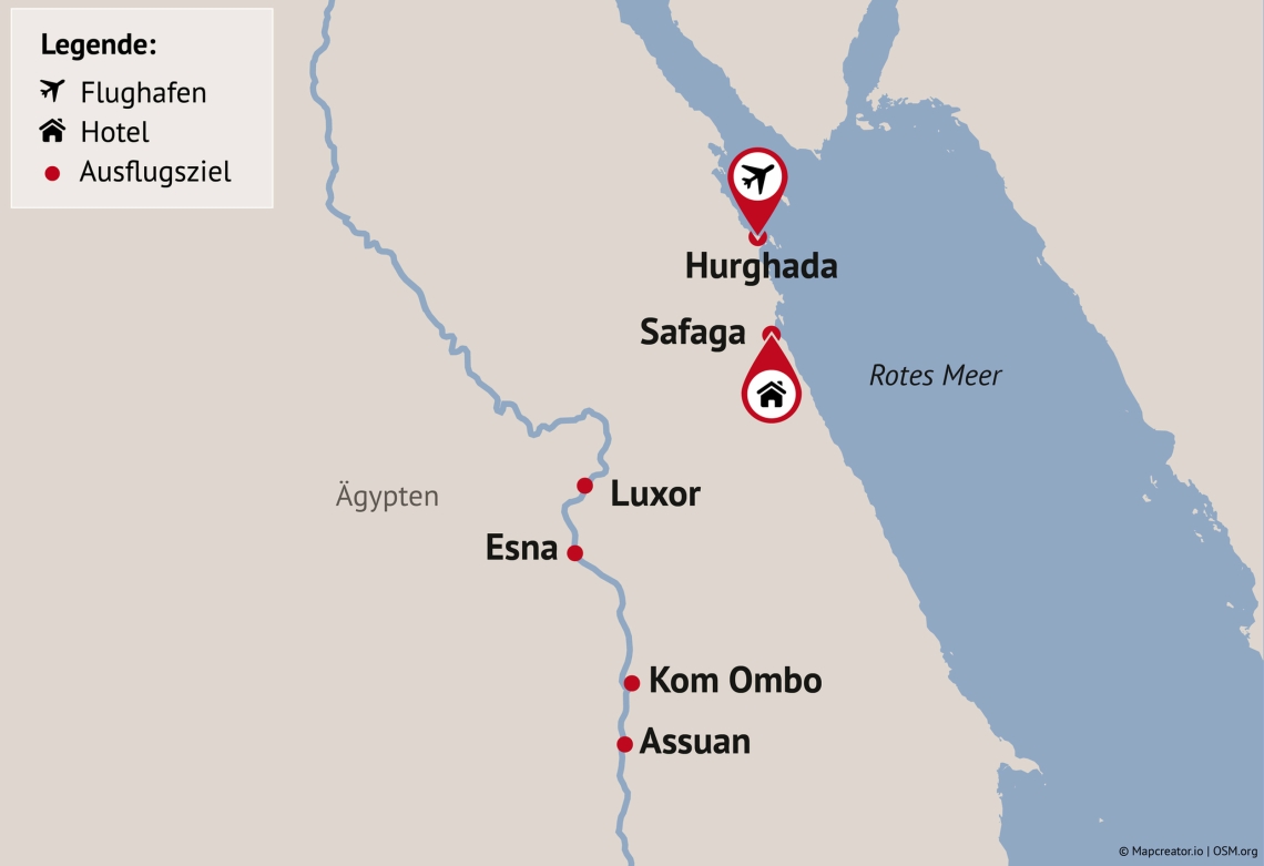 Mit dem Flug nach Hurghada beginnt Ihre Reise nach Ägypten. Schon beim Blick aus dem Fenster kündigt sich eine besondere Zeit an – zwischen Nil und jahrtausendealter Geschichte.