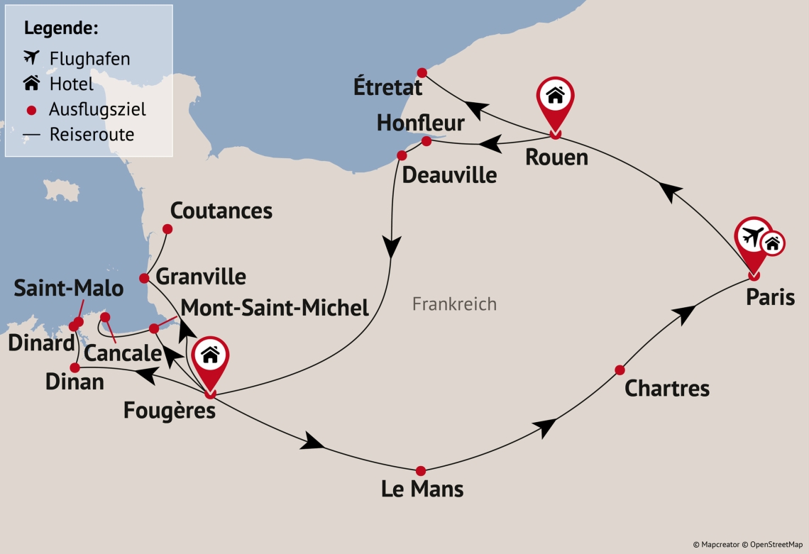 Weiterfahrt nach Deauville. Dieser Badeort besticht mit Eleganz, Boulevards, Pferderennbahn und der berühmten Holzpromenade. Ein Ort wie aus einem alten Film. Am späten Nachmittag geht es in die Bretagne nach Fougères, wo Sie am Abend ankommen.