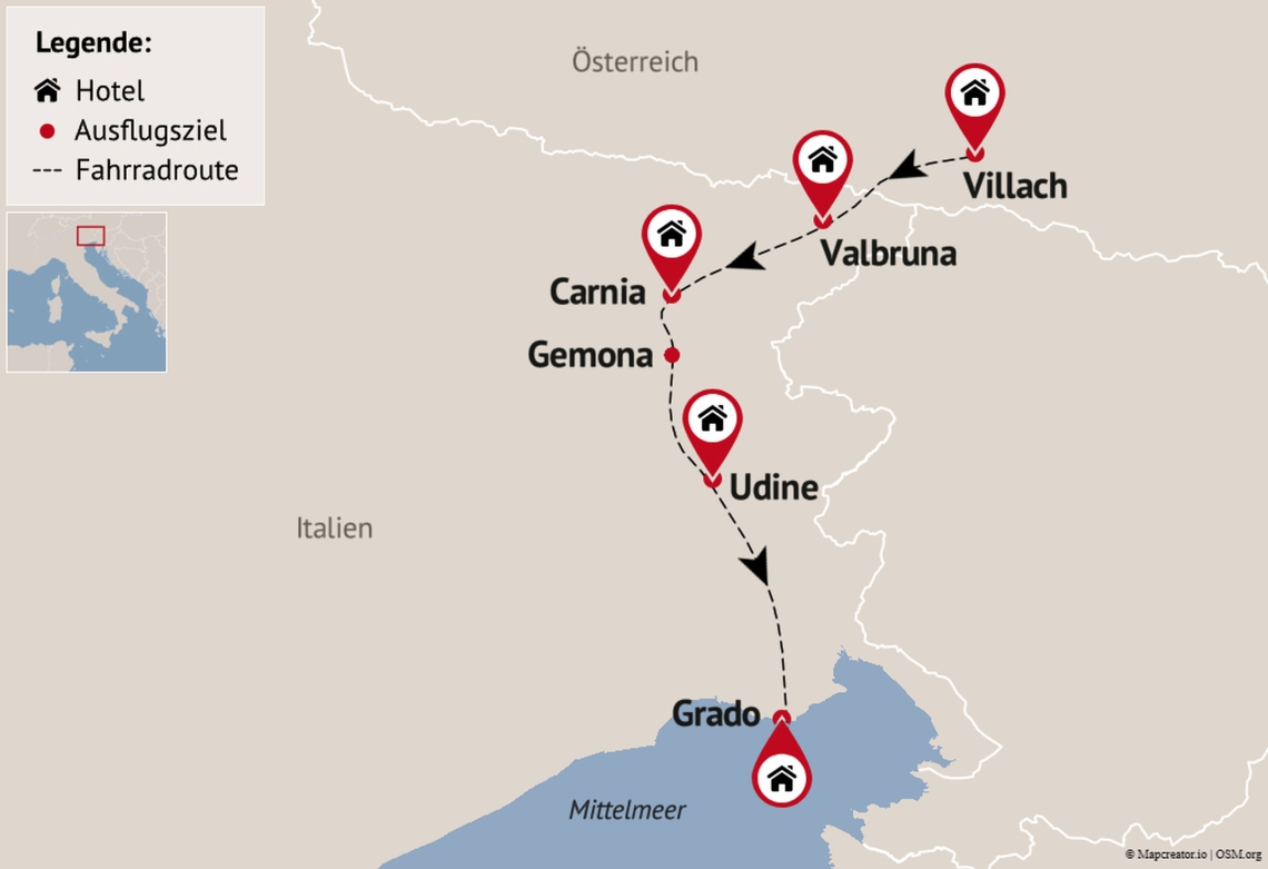 Auf bestens ausgebauten, nahezu autofreien Radwegen durch die Karnischen Alpen erleben Sie das ursprüngliche Österreich von seiner schönsten Seite. Ihre Route verläuft entlang stillgelegter Bahntrassen – heute beliebte Radwege –, durch urige Dörfer und üppige Wälder. Das Fella-Tal beeindruckt mit spektakulären Ausblicken und einer idyllischen Flusslandschaft. Beim Grenzübertritt nach Italien tauchen Sie ein in die Region Friaul-Julisch Venetien, bekannt für ihre bewegte Geschichte, herzliche Gastfreundschaft und kulturelle Schätze.