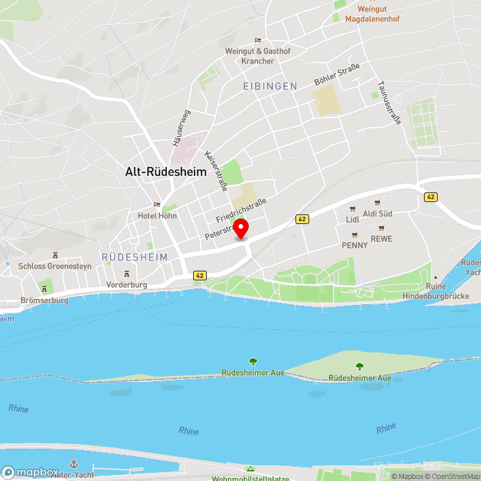 Im Herzen der malerischen Stadt Rüdesheim begrüßt Sie das Rheinhotel Rüdesheim. Ca. 500 m entfernt befindet sich das Zentrum mit zahlreichen Einkaufsmöglichkeiten, Restaurants und Cafés sowie der berühmten Drosselgasse. Auch der nächste Bahnhof befindet sich hier. Atemberaubende Wander- und Fahrradwege durch die herrlichen Weinberge finden Sie in der näheren Umgebung. Unternehmen Sie auch einen Ausflug nach Wiesbaden (rund 28 km entfernt) oder Mainz (etwa 38 km entfernt).