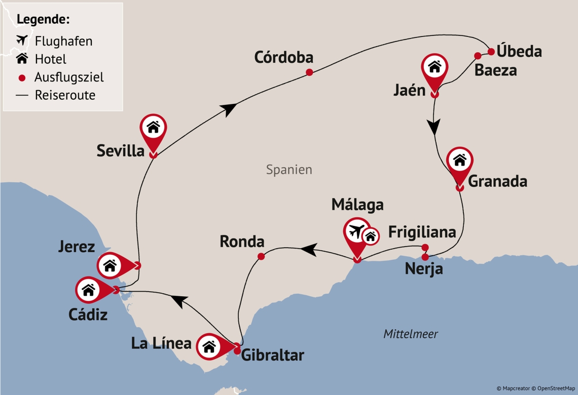 Neben den bekannten Highlights warten auch stille Schätze wie Úbeda und Baeza, zwei Renaissance-Perlen im Herzen Andalusiens. Der Besuch in einer Olivenölmühle samt Verkostung lässt Sie die Region auch kulinarisch entdecken. Wer möchte, kann einen Abstecher nach Gibraltar oder zu einer Flamenco-Show machen. Zum Finale bieten Nerja mit dem „Balkon Europas“ und das Bilderbuchdorf Frigiliana unvergessliche Ausblicke auf das Meer.