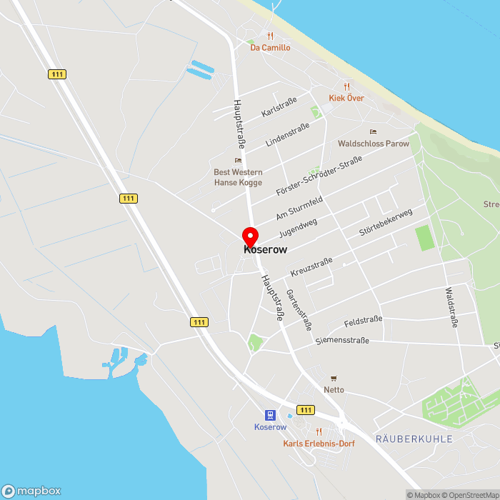 Ihr Hotel liegt im Ostseebad Koserow, an der schmalsten Stelle der Urlaubsinsel Usedom. Die Lage ist zentral und dennoch in herrlicher Landschaft. In wenigen Gehminuten erreichen Sie den feinsandigen Ostseestrand (ca. 1 km). Am Bahnhof Koserow befindet sich in rund 1 km Entfernung auch die nächstgelegene Bushaltestelle. Einkaufsmöglichkeiten sind zu Fuß in etwa 500 m zu finden. Die nächstgrößere Stadt Wolgast erreichen Sie in ca. 17 km und die polnische Hafenstadt Swinemünde in ungefähr 24 km. Die berühmten Kaiserbäder Heringsdorf, Bansin und Ahlbeck sind knapp 19 km entfernt.