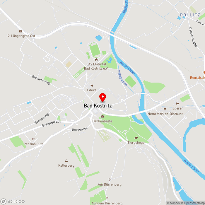 Der Fluss Weiße Elster schlängelt sich durch Bad Köstritz hindurch und macht so manchen Platz dadurch noch romantischer. Wenn Sie einen Spaziergang durch die Stadt unternehmen, dann sollten Sie am Denkmal des Köstritzer Pfarrers und Poeten Julius Sturm einen Schlenker vorbei machen. Als Dichter ging er in die Literaturgeschichte ein. Ein Gedenkzimmer im Palais der Stadt widmet sich dessen Lebenswerk und ist öffentlich zugänglich. Wofür Sie sich darüber hinaus unbedingt Zeit einräumen sollten, ist ein Ausflug nach Gera. Die kreisfreie Hochschulstadt ist gerade einmal rund 10 km entfernt. Die Marienkirche, der Park, die Untermhäuser Brücke und die Orangerie bieten sich für eine Besichtigung an.