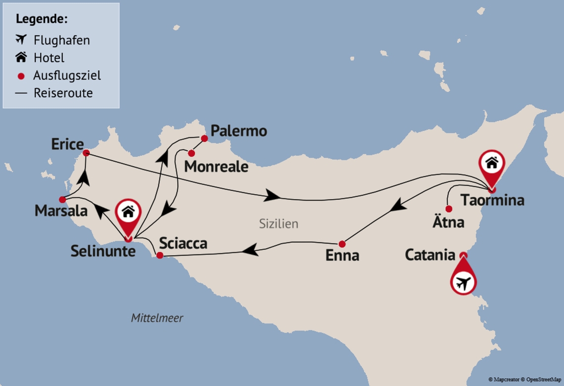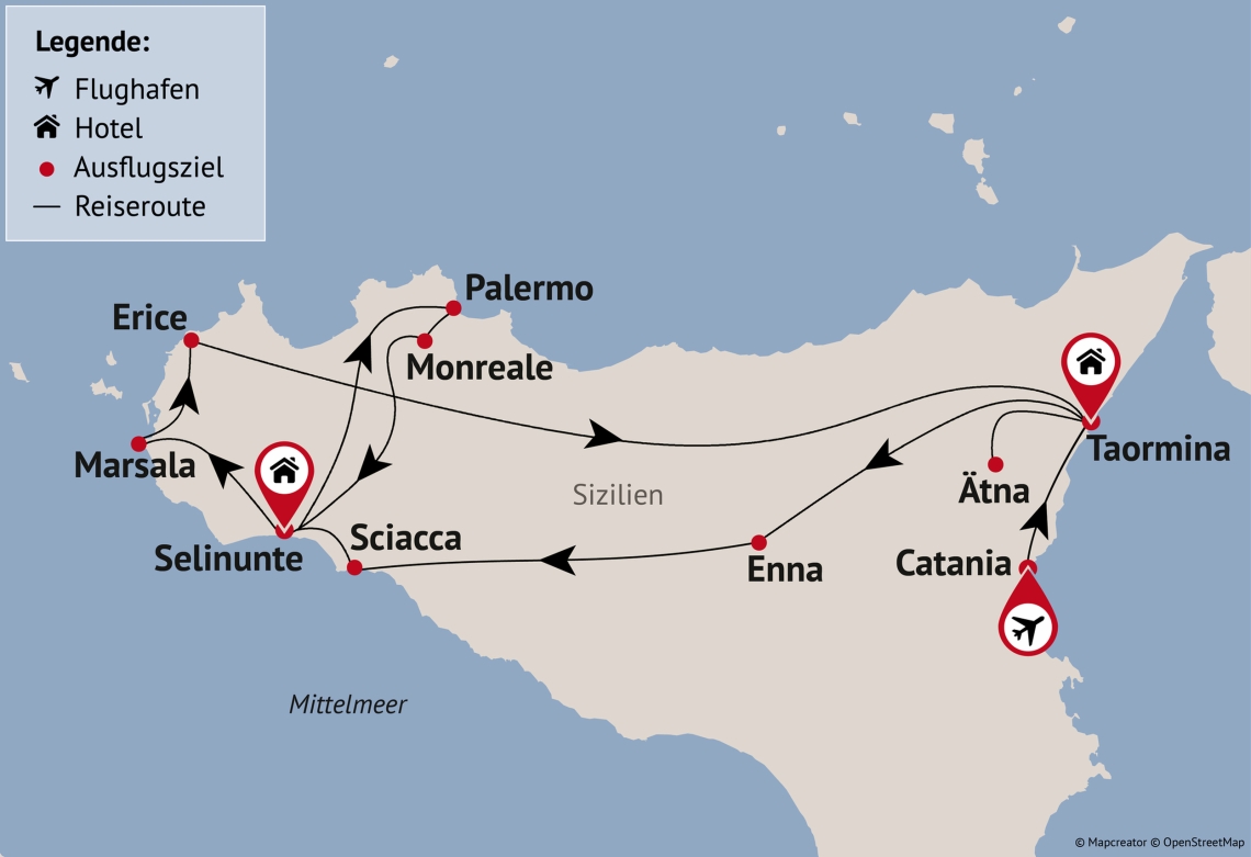 Die Reise beginnt mit einem Höhepunkt im wahrsten Sinne des Wortes: dem Ätna. Rauchend und beeindruckend thront er über der Ostküste. Vom Fuß des Berges geht es weiter nach Taormina – charmant gelegen mit Blick auf das Ionische Meer. Auch das Landesinnere zeigt sich eindrucksvoll: Enna, der „Balkon Siziliens“, und Sciacca mit seinem Hafenflair bieten authentische Einblicke abseits des Trubels. Im Westen erwartet Sie Palermo mit orientalischem Flair und lebendigen Märkten, während Monreale mit seinen goldenen Mosaiken fasziniert.