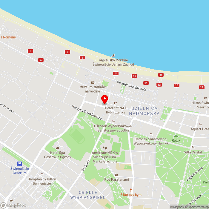 Ihr Hotel befindet sich in Swinemünde (poln.: Świnoujście), der größten Stadt der Ostseeinsel Usedom. Den schönsten Strand der polnischen Ostseeküste erreichen Sie nach ca. 300 m. Das Stadtzentrum liegt nur ca. 2 km entfernt. Der nächste Bahnhof liegt in ca. 1 km Entfernung. Eine Bushaltestelle liegt etwa 300 m entfernt. Besuchen Sie die Kaiserbäder Ahlbeck (etwa 6 km), Heringsdorf (knapp 9 km) und Bansin (rund 10 km).