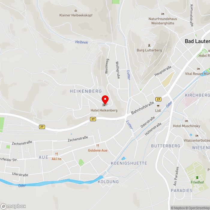 Das Hotel Heikenberg liegt in Bad Lauterberg im Harz. In etwa 800 m erreichen Sie das Ortszentrum. Die nächste Bushaltestelle befindet sich rund 600 m und der nächste Bahnhof (Bad Lauterberg/Barbis) ca. 4,5 km vom Hotel entfernt. Innerhalb von knapp 20 km finden Sie außerdem das größte Skigebiet Norddeutschlands – den Wurmberg bei Braunlage. Die nächstgrößere Stadt Göttingen erreichen Sie in ca. 43 km.