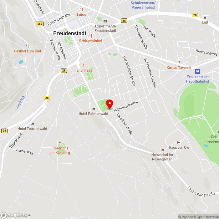 Im Herzen des heilklimatischen Kurortes Freudenstadt im Schwarzwald, nur ca. 900 m vom Stadtzentrum mit zahlreichen Sehenswürdigkeiten und Einkaufsmöglichkeiten entfernt, erwartet Sie Ihr Wellnesshotel zu einer erholsamen Auszeit. Den Bahnhof von Freudenstadt erreichen Sie nach rund 1,5 km. In der Umgebung finden Sie zahlreiche Fahrrad- und Wanderwege.