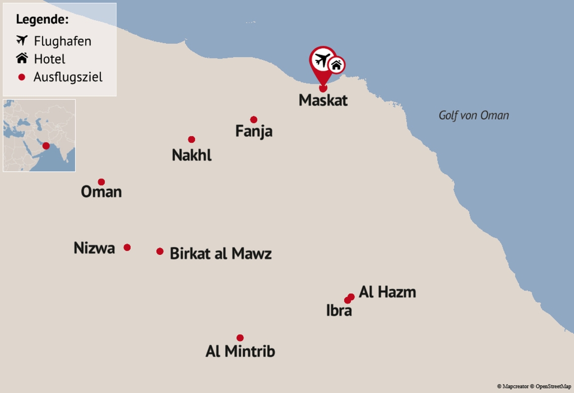 Glitzernde Moscheen, weite Dünen und grüne Oasen: Diese Reise führt Sie mitten hinein in die faszinierende Welt des Orients. Maskat, die Hauptstadt des Oman, ist Ihr komfortabler Standort – von hier aus entdecken Sie das Land der Kontraste in all seiner Vielfalt.